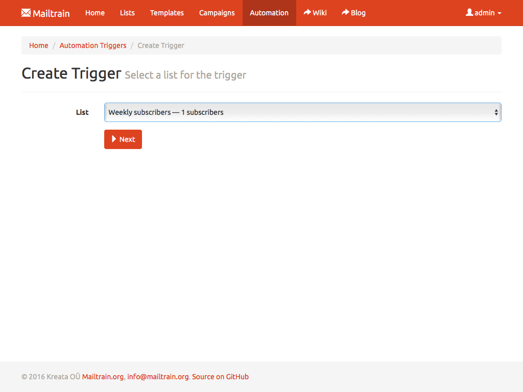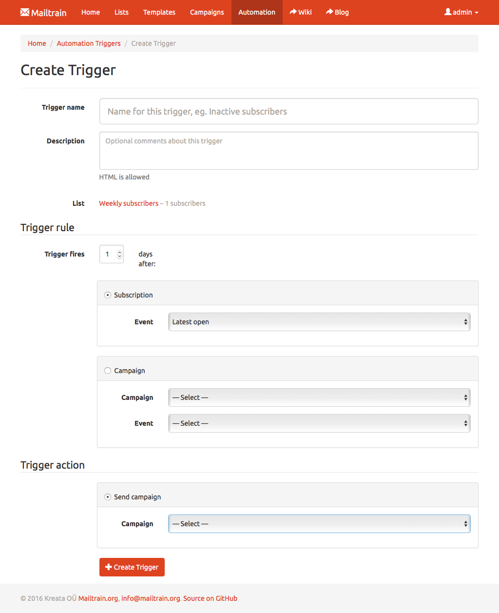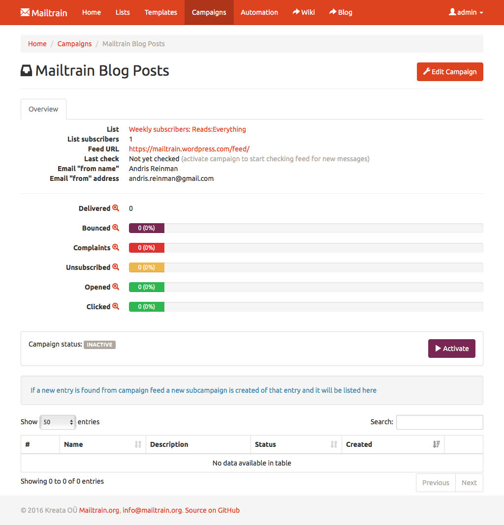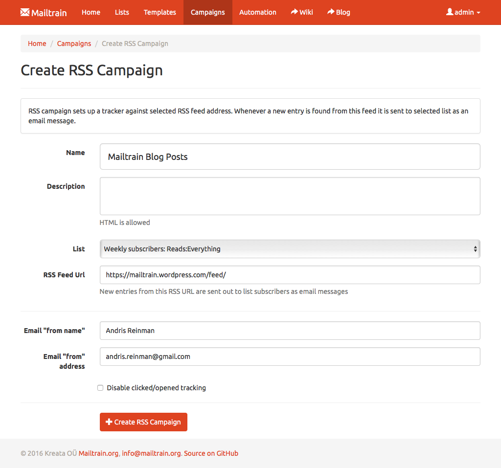 Configura Mailtrain per tracciare i feed RSS e se viene identificato un nuovo ingresso Mailtrain auto genera una nuova campagna utilizzando i dati del contenuto del messaggio del feed e lo invia agli iscritti selezionati.