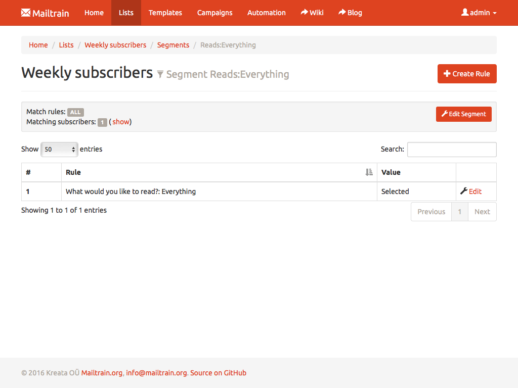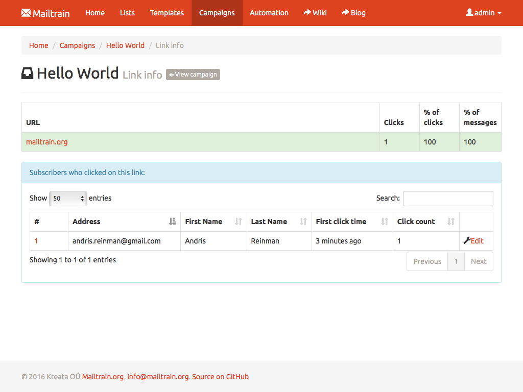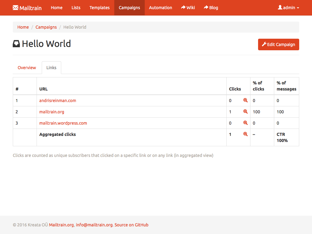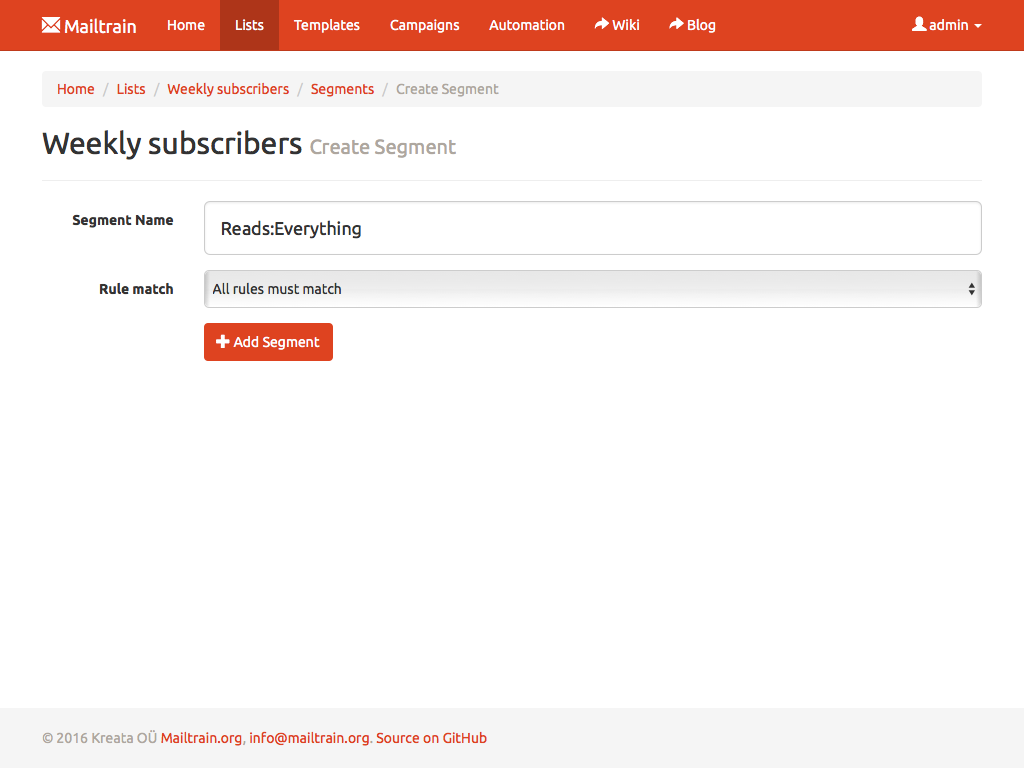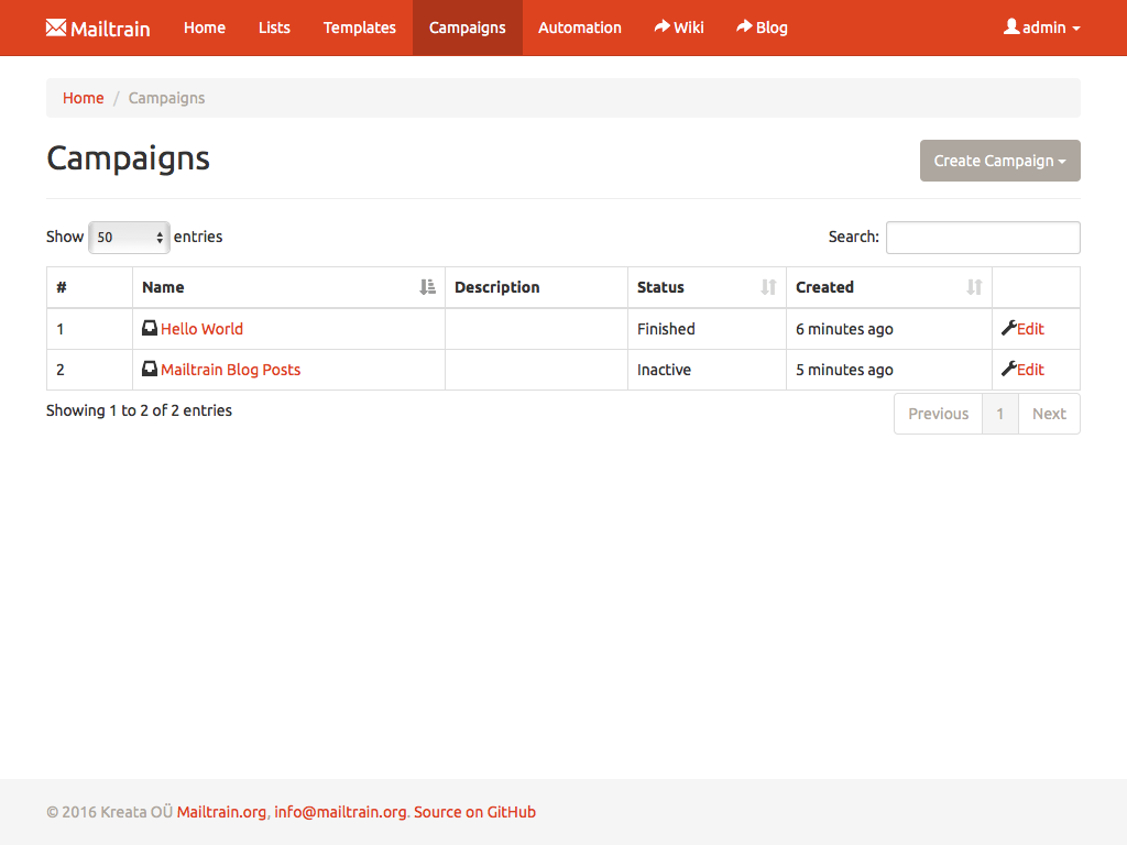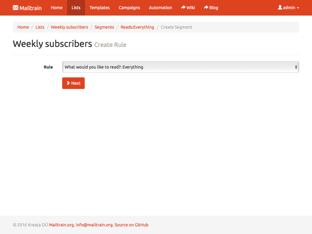 Configura Mailtrain per tracciare i feed RSS e se viene identificato un nuovo ingresso Mailtrain auto genera una nuova campagna utilizzando i dati del contenuto del messaggio del feed e lo invia agli iscritti selezionati.