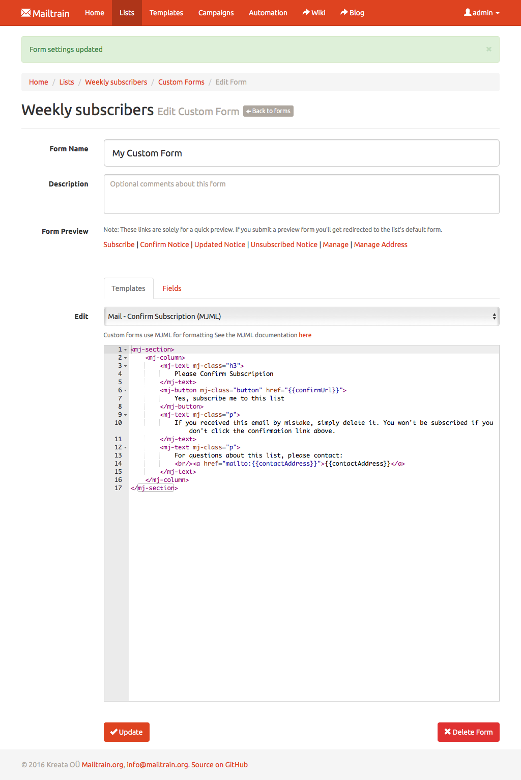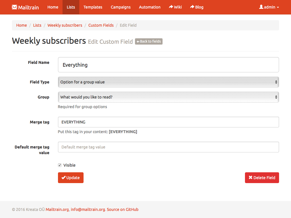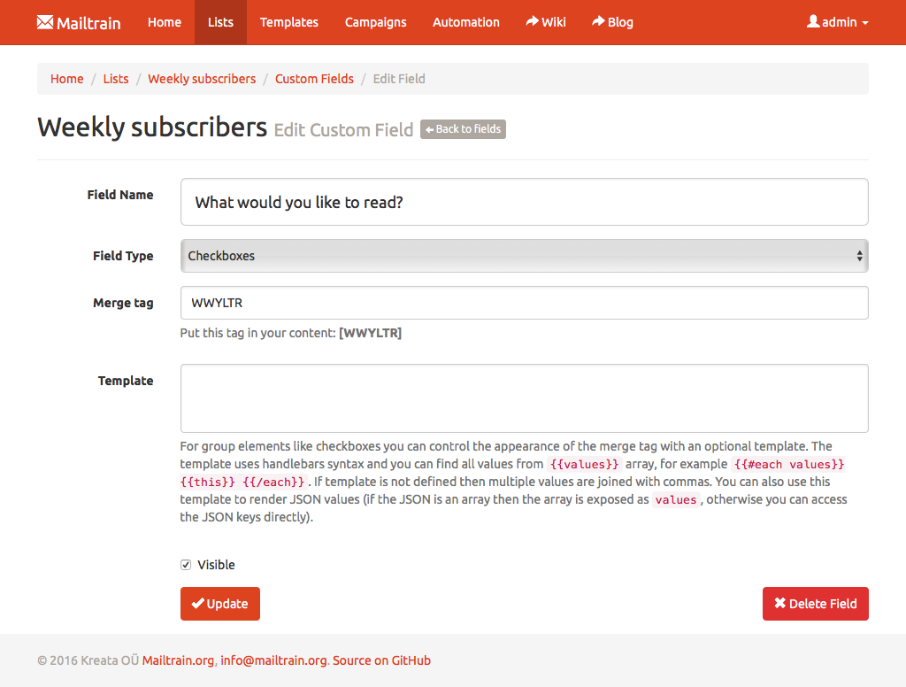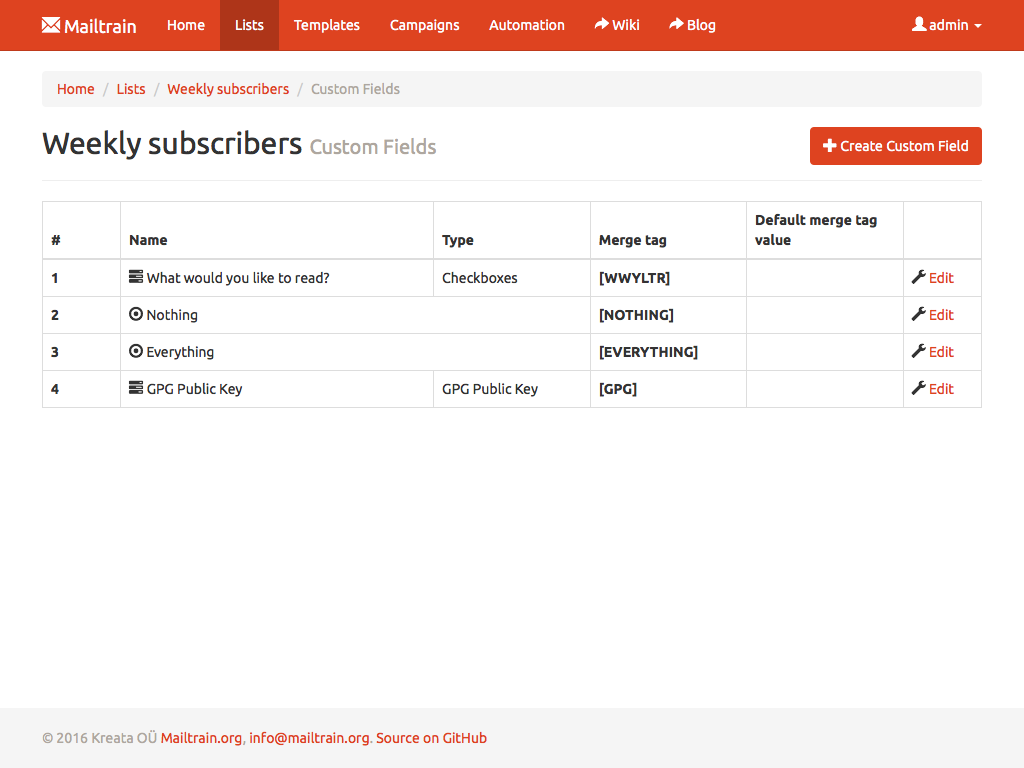 Campi di testo, numeri, drop downs o segni di spunta, Mailtrain li implementa tutti. Ogni campo personalizzato può essere incluso nella newsletter generata tramite i tag di merge. Mailtrain supporta form personalizzati