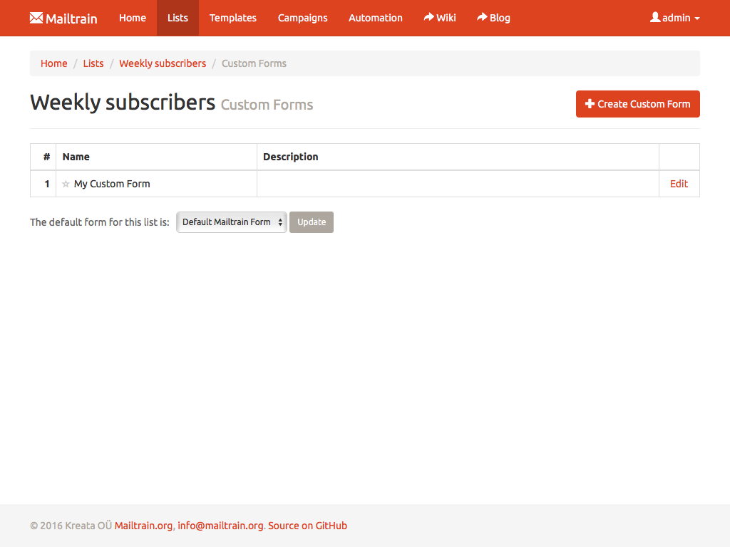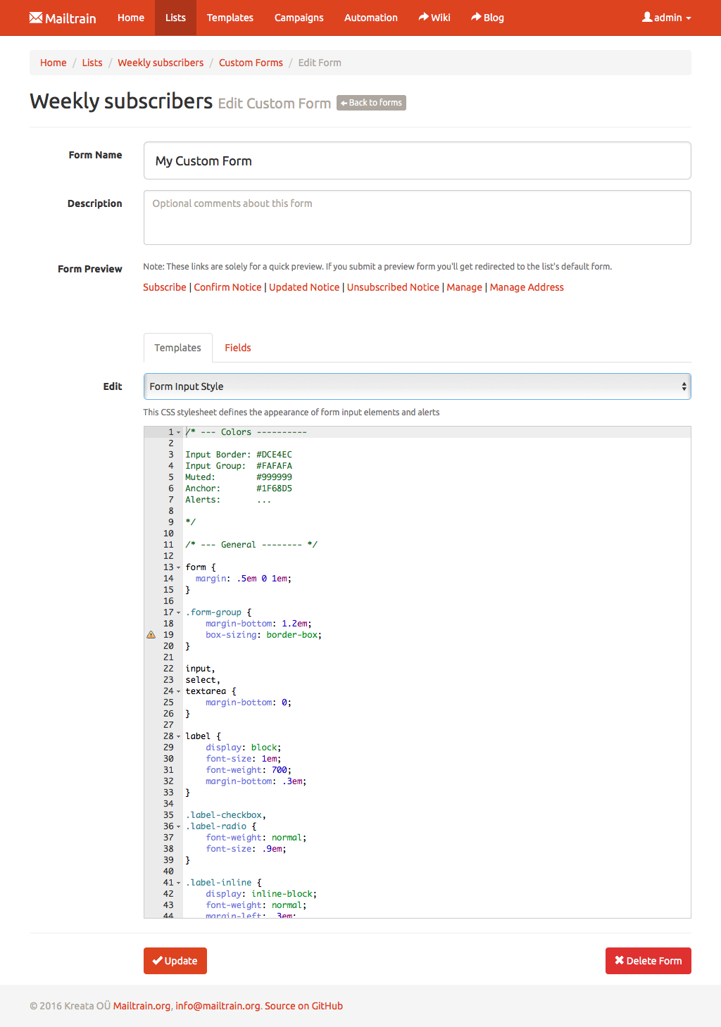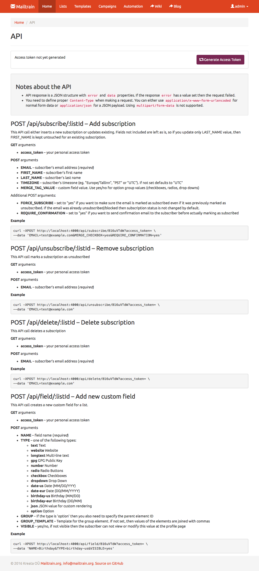 Campi di testo, numeri, drop downs o segni di spunta, Mailtrain li implementa tutti. Ogni campo personalizzato può essere incluso nella newsletter generata tramite i tag di merge. Mailtrain supporta form personalizzati