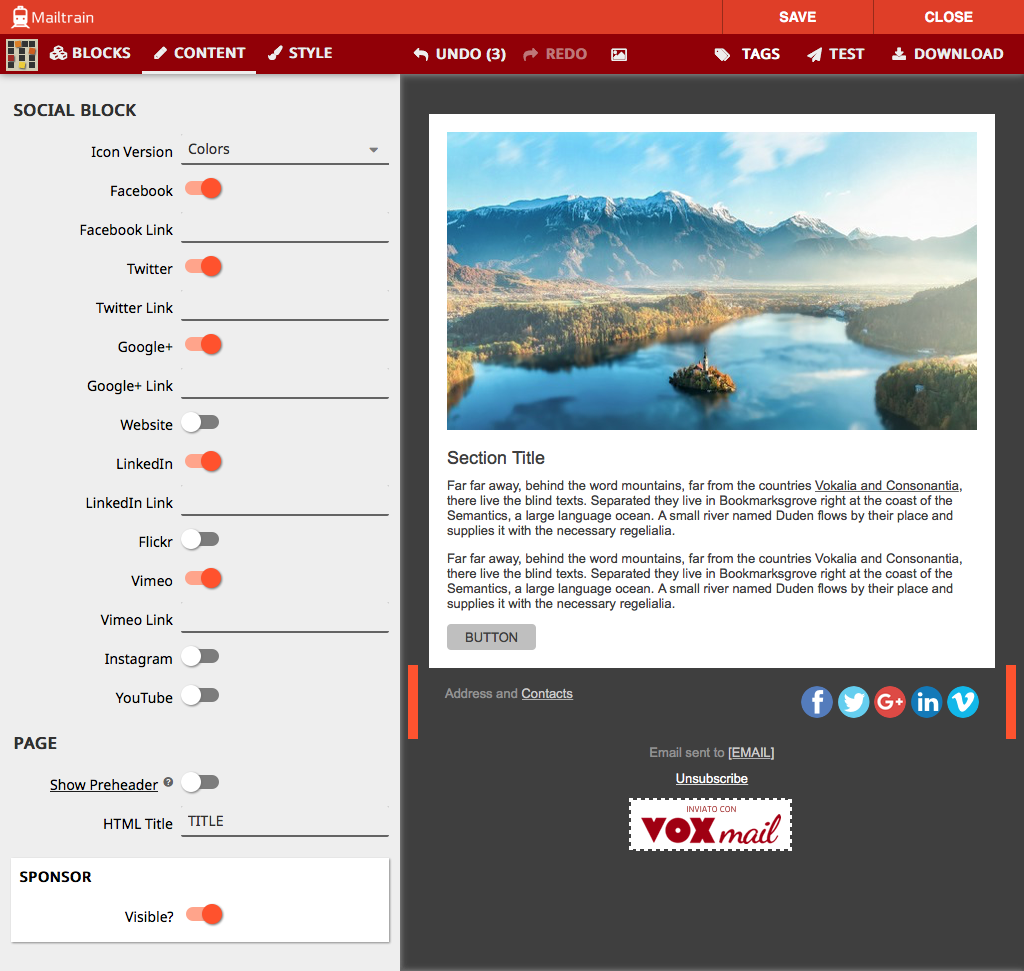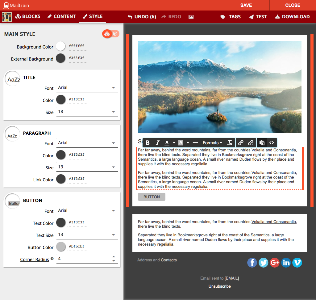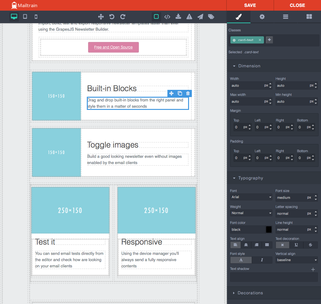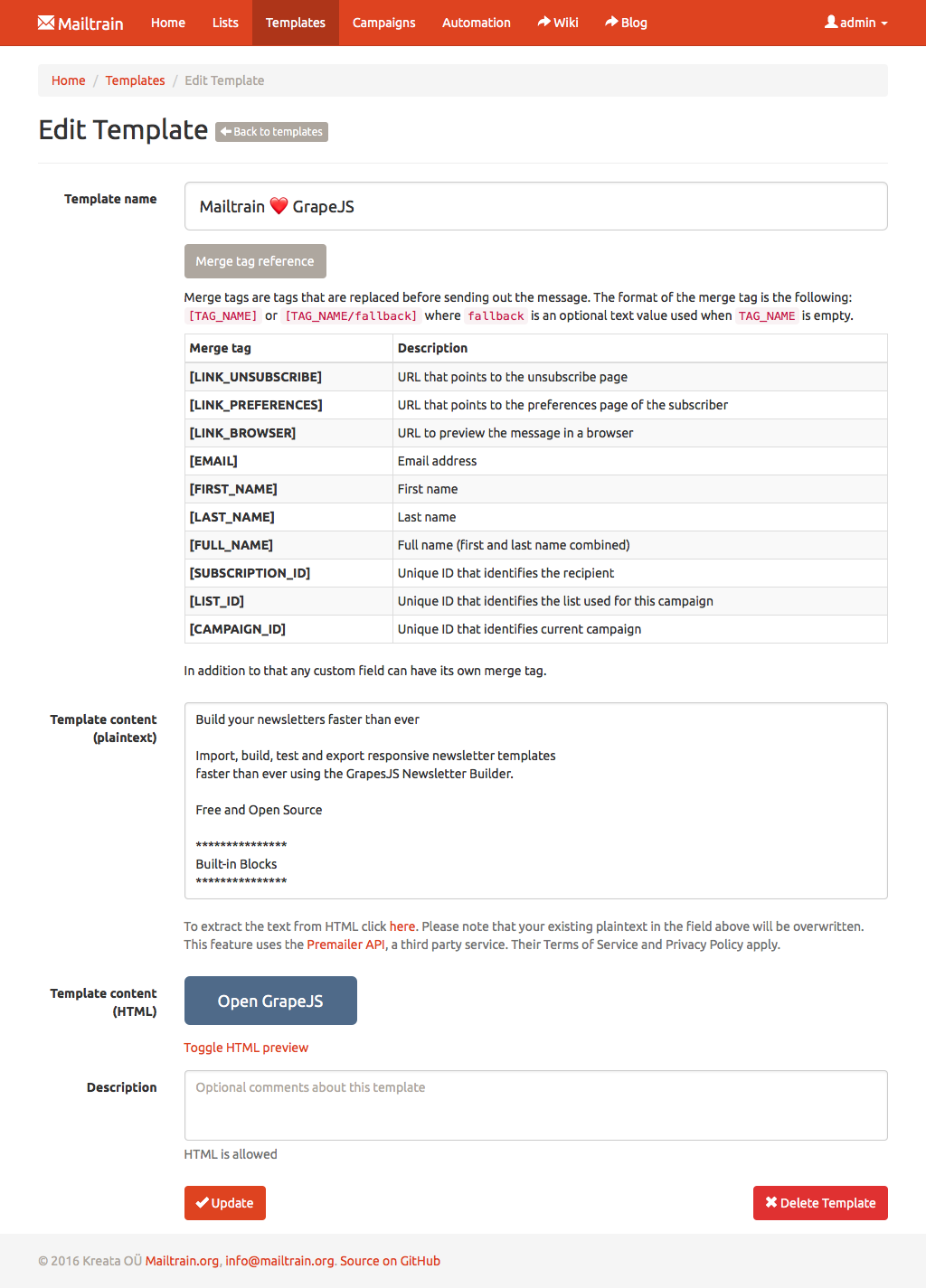 Mailtrain include GrapeJS e Mosaico, due editors di template avanzati. Mailtrain offre inoltre un editor di codice se preferisci scrivere tu l'HTML.