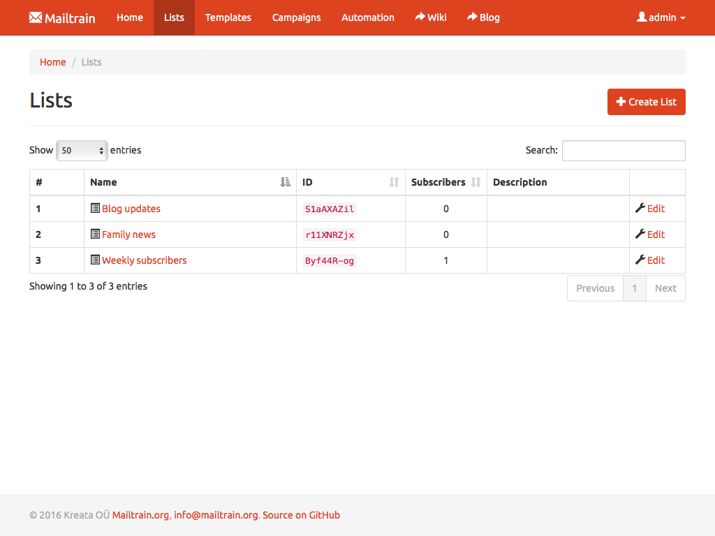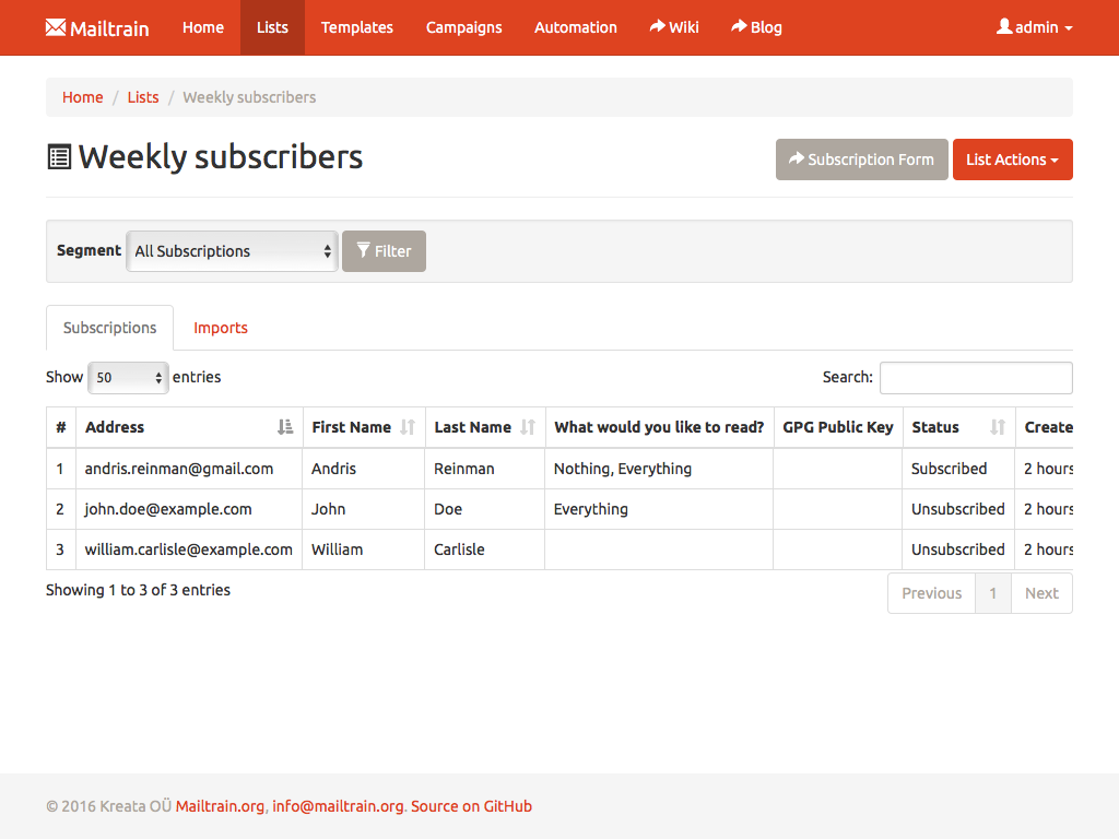 Mailtrain ti permette di gestire facilmente grosse liste. Milioni di iscritti? Nessun problema. Puoi aggiungere iscritti manualmente, via API oppure importarli tramite CSV. Tutte le liste hanno la possibilità di aggiungere campi personalizzati e tag di merge.
