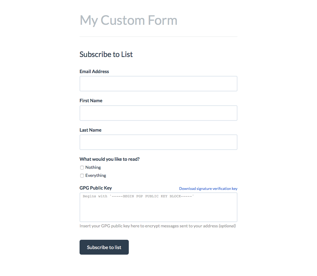 Se una lista ha un campo personalizzato per un set di chiave pubblica GPG allora gli iscritti possono caricare la loro chiave GPG pubblica per ricevere messaggi criptati dalla lista.
